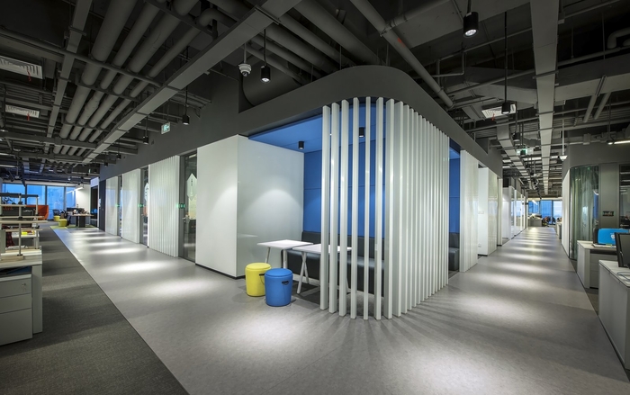 開(kāi)放式工作區(qū)和建設(shè)的核心–本身的包裹封閉的會(huì)議空間是一個(gè)循環(huán)的–走廊4m幅寬和對(duì)比地板的顏色給它運(yùn)行軌道的感覺(jué)之間的象征。