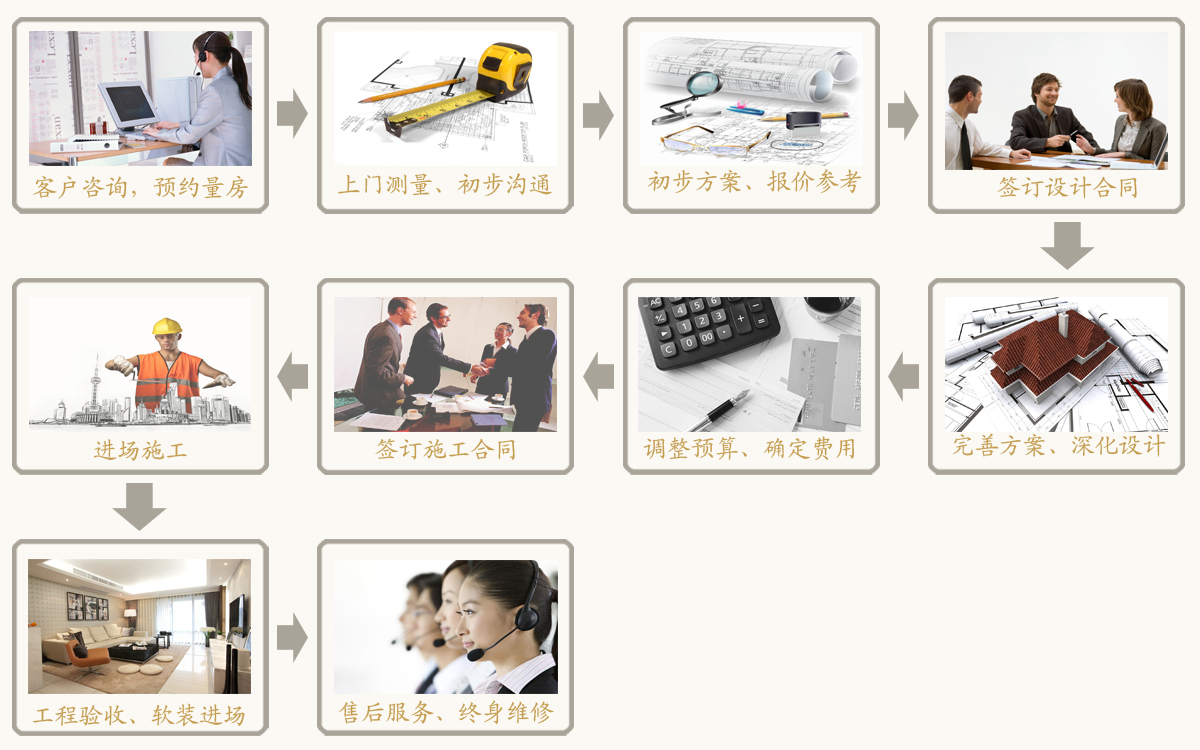 一:客戶咨詢、預約量房(1) 當客戶與公司取得聯(lián)系時,我們會對客戶信息進行分類、立項、備案;客戶對裝修不明白的問題,客服將會為客戶一