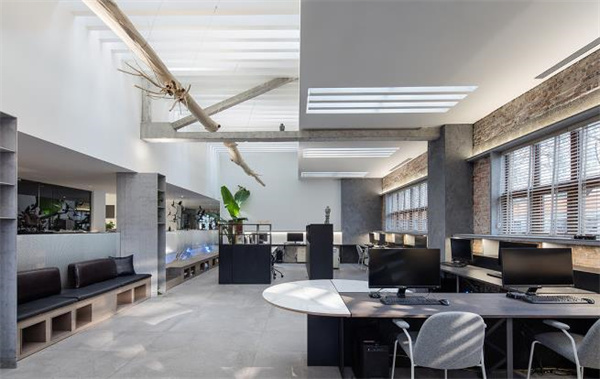 700平米的辦公室裝修設(shè)計(jì):設(shè)計(jì)師們保留了老建筑的原始磚墻,只對(duì)吊頂做了百葉格柵的造型設(shè)計(jì),與陽光順向的造型也起到了調(diào)節(jié)空間光線的作用,另外這個(gè)地方我們還吊掛了一棵一分為二的大樹。使用率較高的地方叫做“工作空間”,把較好的南北方向空間給到整個(gè)的工作空間,用較流暢的動(dòng)線來組合這個(gè)部分?!爸獠繀^(qū)域”是我們提出來的一個(gè)概念,這一部分區(qū)域完成的是企業(yè)合作伙伴在工作中的協(xié)同作戰(zhàn)訴求,其應(yīng)該被設(shè)置在有獨(dú)立出入口的中部空間。“形象區(qū)域”是企業(yè)面對(duì)客戶的精神堡壘,我們會(huì)將其設(shè)置在空間的重點(diǎn)區(qū)位。在辦公室的后邊有一條單獨(dú)的樓梯通往樓下的茶室,也就是在一個(gè)30平米的位置中,又可以重新組成一個(gè)封閉的LOFT空間,滿足我一個(gè)人的創(chuàng)意設(shè)計(jì)和客人接待需要,這個(gè)算是留給自己的一點(diǎn)小私心。