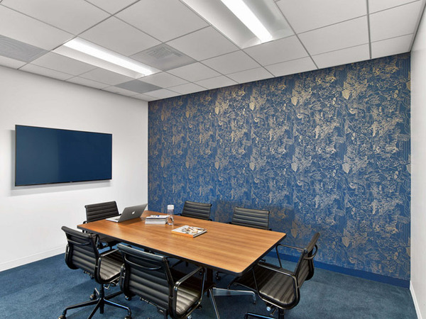 橡木定制的辦公家具和白色亞光鋼架、精挑細(xì)選的壁紙、雪白色的接待臺以及休閑茶水區(qū)的網(wǎng)狀編織吊燈。