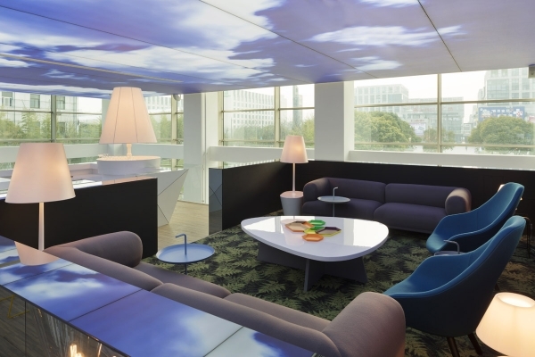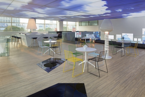 盡管這是個(gè)室內(nèi)空間,裝修設(shè)計(jì)師仍希望通過大自然的圖案為來客營造舒適的感覺。天空圖案的天花,樹形的支柱,植物圖形,明亮的淺色調(diào),木制材料和流線型的花園等,這些眾多的元素都將這個(gè)展廳裝點(diǎn)得與傳統(tǒng)意義上的售樓展廳與眾不同。