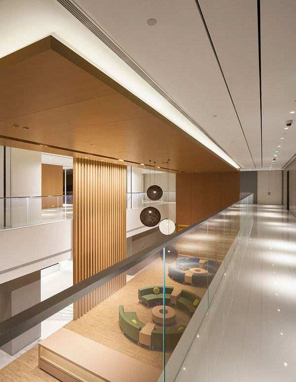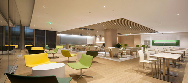 新的辦公中心非常注重員工的休閑空間的設(shè)置,西側(cè)挑空層設(shè)置了大型員工書(shū)吧 及休閑區(qū)域。