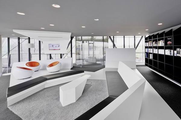 從這里,可以欣賞壯美的法蘭克福城市景觀。多邊形的空間元素與豐富的建筑材料代表了公司本身對設計構成的高標準要求。開敞透明的辦公區(qū)域搭配半開放以及私密會談區(qū)域,促進了充滿創(chuàng)造力和積極交流的工作氣氛。