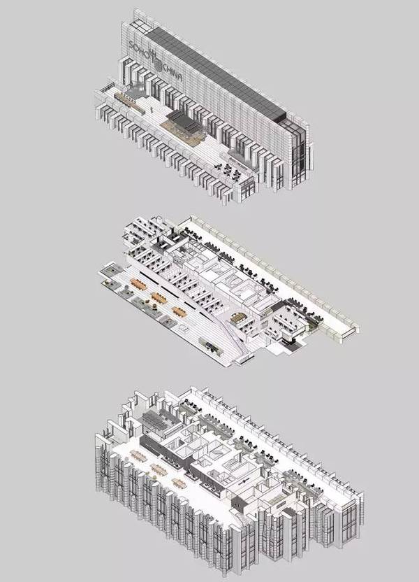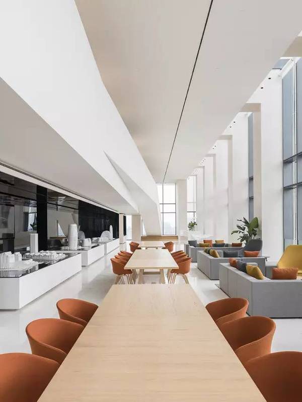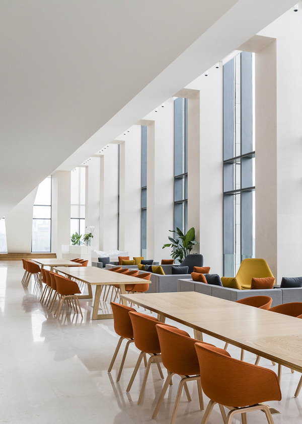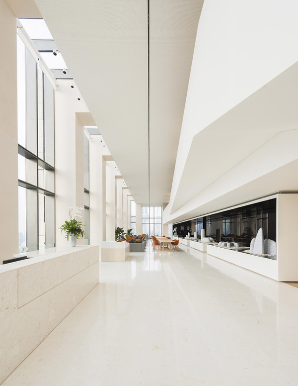 室內(nèi)和室外同時(shí)使用了簡化的米黃色的石材,作為對于外灘老上海建筑的一種追溯,還使用仿佛能把人帶入未來的簡潔而堅(jiān)硬的白色墻面。此外還有許多的小細(xì)節(jié):電梯廳附近45度的傾角;奶油色的石材使得空間看上去更加開闊;明亮的光照,在上海的古老和現(xiàn)代之間尋找到平衡。