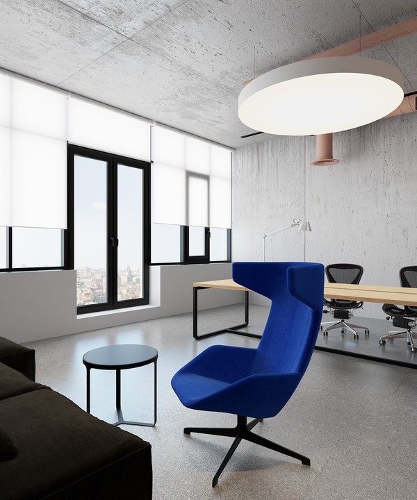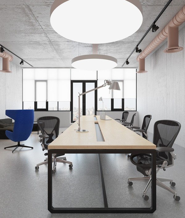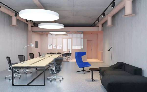 外露的鋼管也被粉刷成粉色,整個(gè)空間采用混凝土鋪陳,從地面延伸至墻面,天花,統(tǒng)一的材質(zhì)讓空間變得簡(jiǎn)潔,干凈,中央擺放著一張長(zhǎng)條形的巨型辦公桌,通過(guò)淡色木質(zhì)面板以及黑色鐵件塑造出輕盈靈巧的視覺(jué)感受。休息區(qū)用黑色轉(zhuǎn)角沙發(fā)搭配鮮艷的寶藍(lán)色單人椅,帶來(lái)鮮明的對(duì)比。