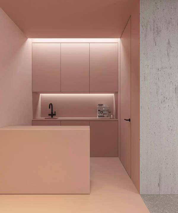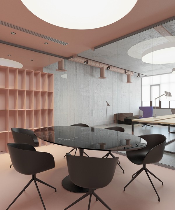 用玻璃隔斷劃分出會(huì)議室,肉粉色的空間搭配質(zhì)感的黑色桌椅,柔美與硬朗相互沖突,形成強(qiáng)烈的視覺(jué)感受。