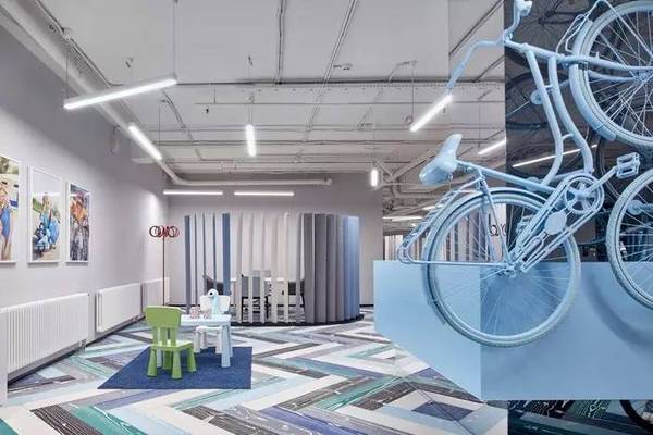 這種梯級的色彩配比猶如美麗的風(fēng)景畫一般令人賞心悅目,也再次點明本案的設(shè)計主題:運動、青春、以及浪漫主義的藝術(shù)情懷。接待臺旁邊那一組粉藍色自行車藝術(shù)裝置再次強化了這個設(shè)計主題。接待區(qū)的多元混搭組合設(shè)計,也在向大家傳遞這是一個多功能綜合型的辦公室屬性。