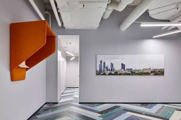 辦公場地的前身是一個停車場,頂面有著眾多龐雜的管道系統(tǒng)。設(shè)計師的解決方法是首先把整個室內(nèi)空間全部噴成白色,包括所有的孔隙、格子以及頂面眾多的機電管道。清一色的白色噴涂令原本雜亂無章的空間成為一個干凈明亮的視覺整體。隨后,設(shè)計師為這個純凈的空間注入他們在本案所要表達的創(chuàng)意主體和色調(diào):漂亮的地面設(shè)計。采用仿木地板的瓷磚,分別制作成藍色、灰色、綠色、白色、黑色,幾組色彩以人字紋交錯排列,在偌大的空間里形成**動感和視覺魅力的空間效果。