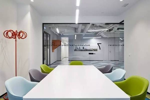 沿墻布局的會議室、辦公室等獨立空間與開放區(qū)域僅由通透的玻璃做隔墻,以保證空間在視覺效果上的連貫和完整性。并且這些獨立空間的頂和墻不做任何其它修飾,只在地面的地毯拼貼上延續(xù)整體的色彩搭配。