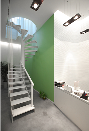 裝修的色彩并不是多種顏色搭配呈繽紛靚麗的景象,而是簡單的青綠色為主題,經(jīng)典黑白色輔助映襯。綠色的裝修裝飾給人青春活力的感覺,用在這里再合適不過了。其次是樓梯的造型設(shè)計,圓形旋轉(zhuǎn)樓梯,造型上的別致同樣也帶來了異樣的體驗。