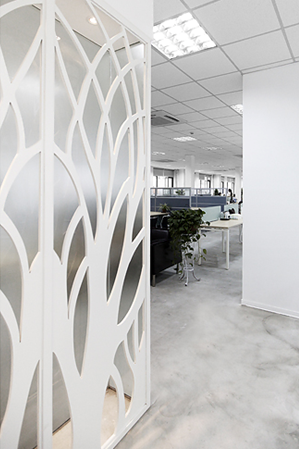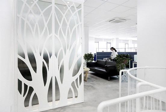 辦公室裝修的屏風(fēng)設(shè)計不僅僅是處于玄關(guān)的作用而設(shè)置,也有著很大的裝飾作用。鏤空的樹形結(jié)構(gòu)造型設(shè)計,一層模糊的鋼化玻璃,隔絕視線的同時,也營造了一個朦朧而富有趣味性的室內(nèi)空間。