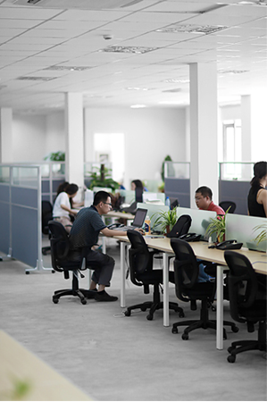 辦公區(qū)域的設(shè)計是整個公司里*為自由的區(qū)域,工位連成一片但是距離的保持并不會讓人覺得狹窄擁擠,沒有過分拘束的辦公氛圍讓員工大可以卸下緊張情緒,輕松辦公。綠色植物盆栽在室內(nèi)隨處可見,飛拓企業(yè)對于裝飾及綠化的重視程度可見一斑。