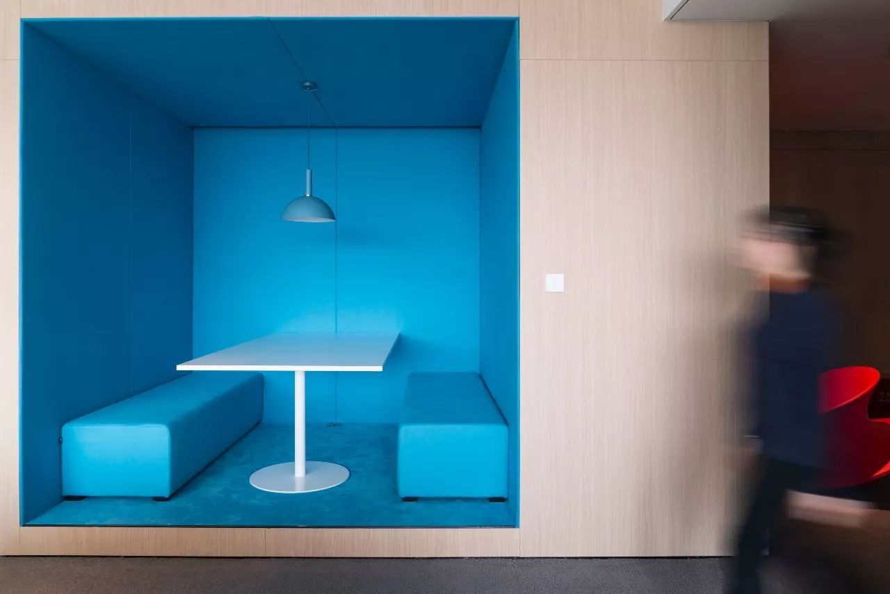 每個(gè)單獨(dú)的盒子,被賦予簡(jiǎn)單純粹的色彩和材質(zhì),比如包裹墻面和天花的彩色吸音毛氈,有效降低與其他區(qū)域的相互干擾,實(shí)現(xiàn)**的聲學(xué)效果。人在里面活動(dòng)時(shí),空間和人的關(guān)系,以及人與人的關(guān)系變得更緊密而有趣,同時(shí)獲得一種沉浸式的空間體驗(yàn),使討論或工作變的更放松和專注。