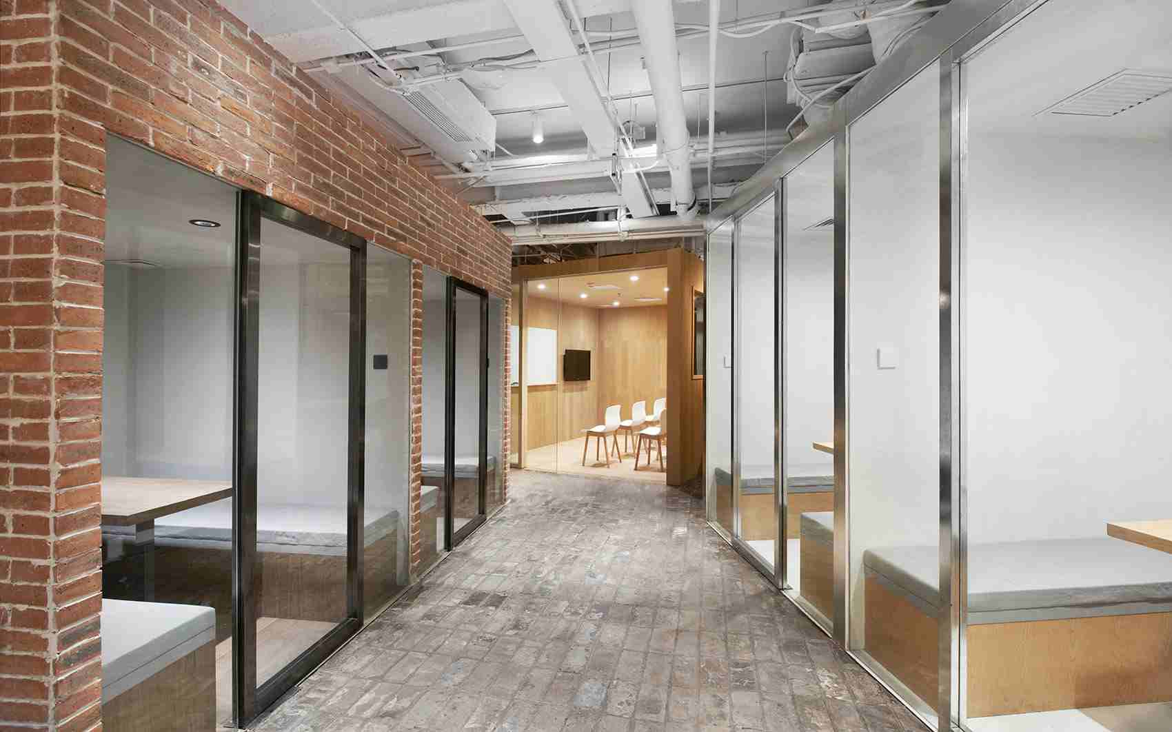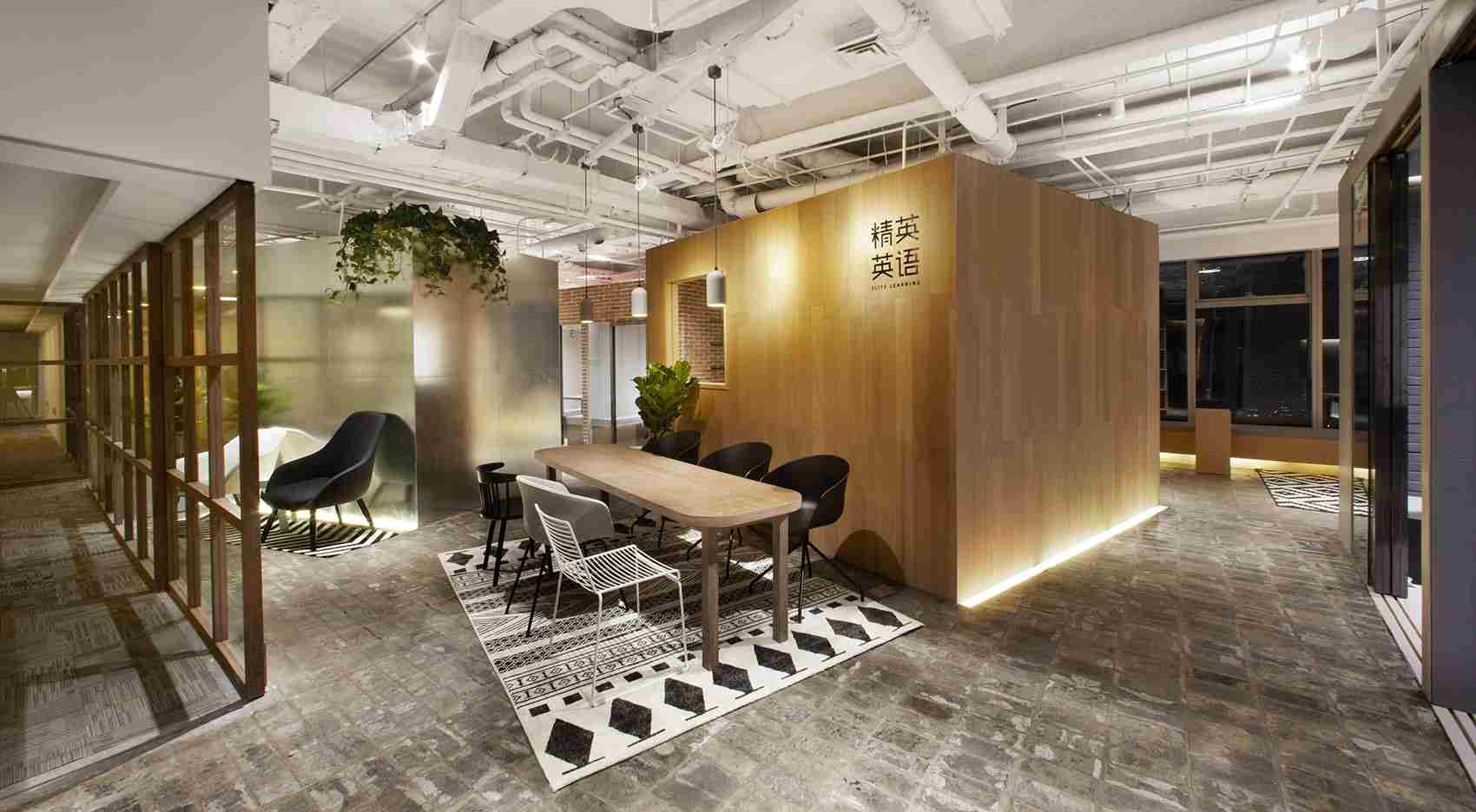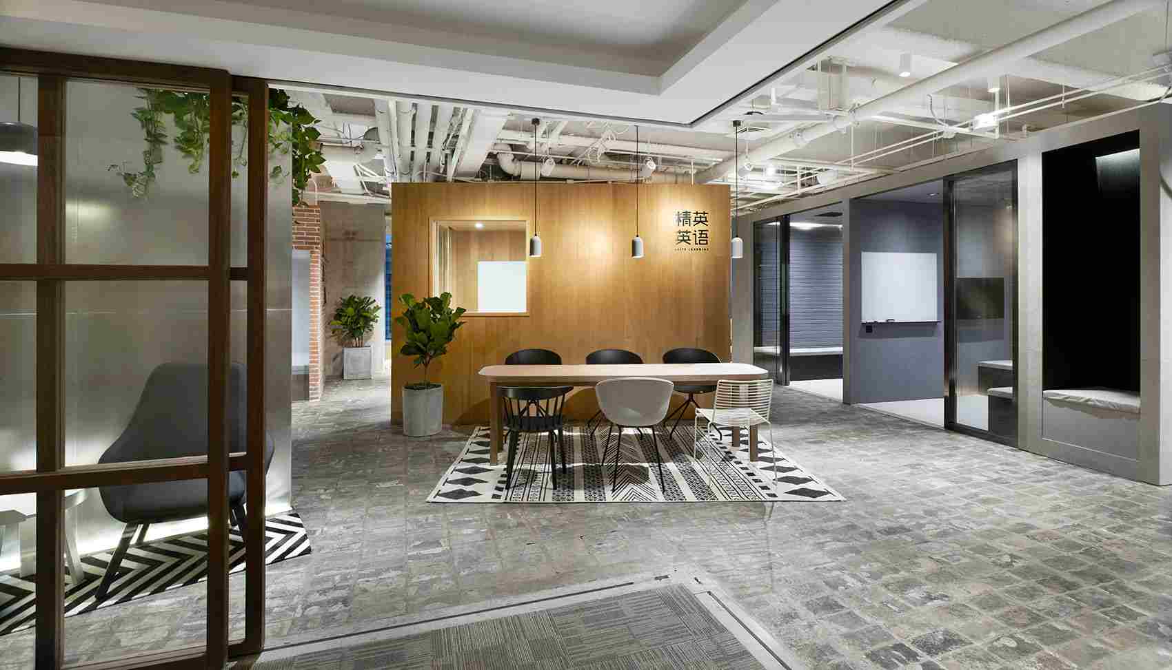 項目位于一座辦公樓內(nèi),業(yè)主租賃三個房間作為學校的辦公和培訓區(qū)域。為了整合全部的空間的使用,設(shè)計師將其打通成為一整個房間。