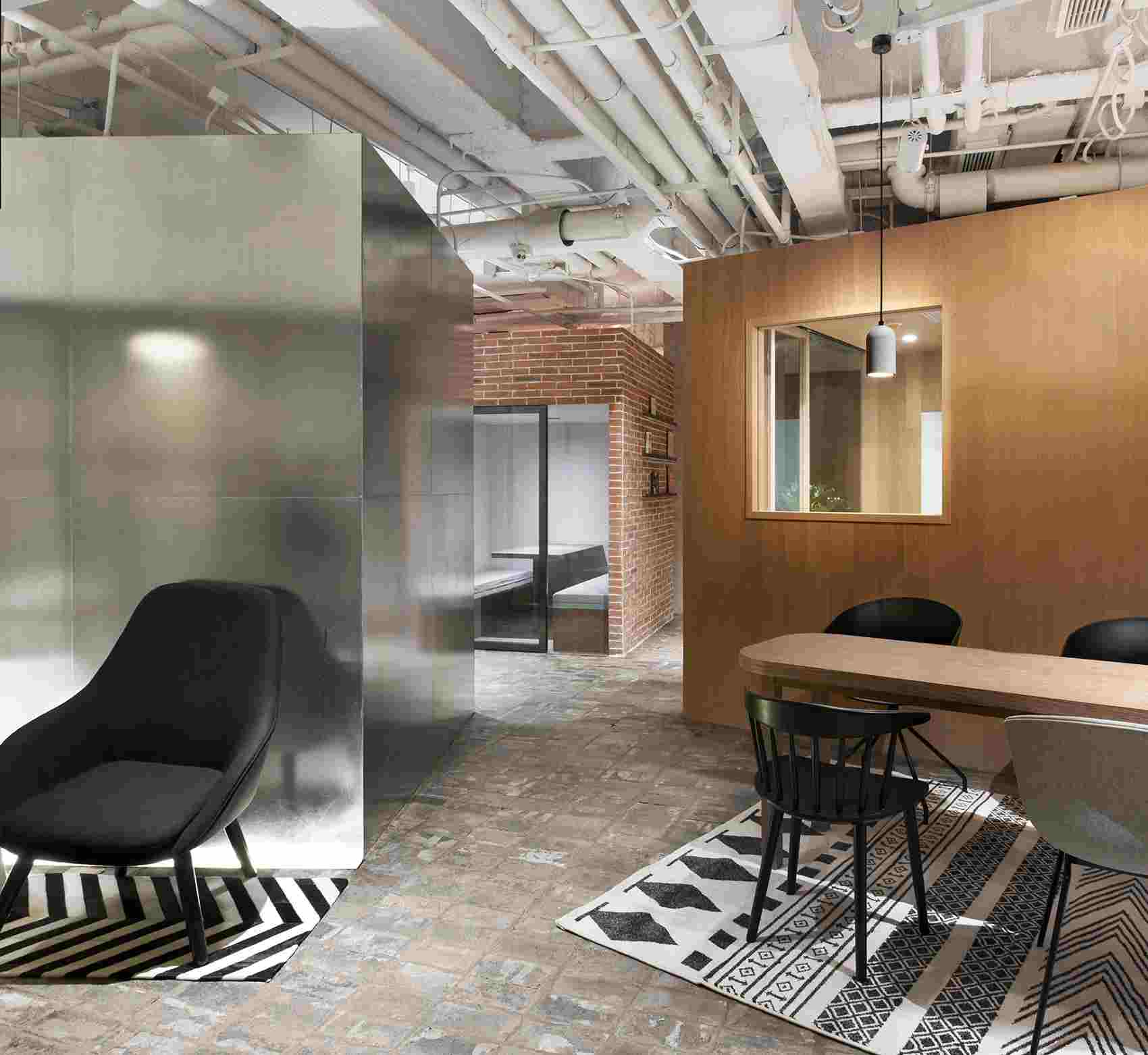 入口處,兩扇2000mm寬的大門設(shè)計,當玻璃門打開時,室內(nèi)和走廊形成了相對開放的空間。房間使用了不同的材質(zhì),鍍鋅鋼板,水泥板,木板,紅磚,作為盒子的表面材料。地面則使用了灰磚,地面的破舊感和房子的不同材質(zhì)的對比,形成很大的反差,給人以強烈的視覺沖擊力。