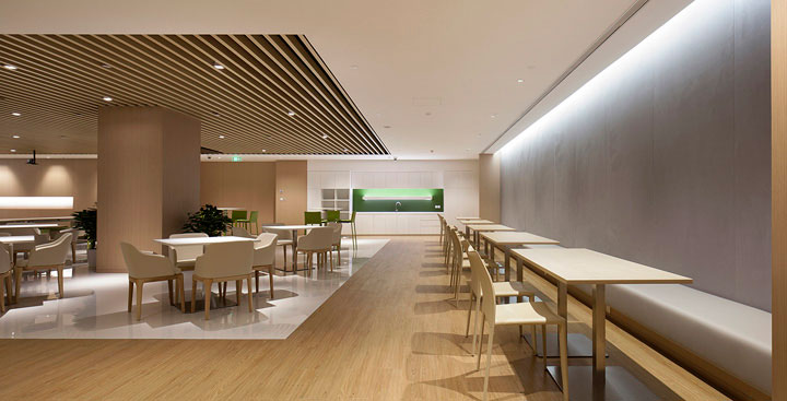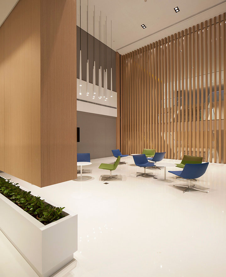 從地面延伸到天花的木色及縱向木色格柵,為員工營(yíng)造溫馨舒適的緩沖空間并可作為開放討論區(qū)使用。