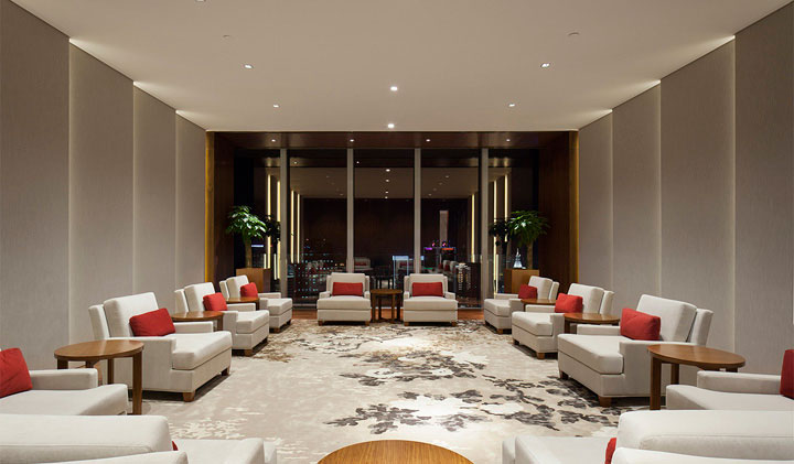 接待區(qū)的造型整體簡(jiǎn)潔**視覺沖擊,正面縱向的木色格柵代表造紙業(yè)的原材料木材。