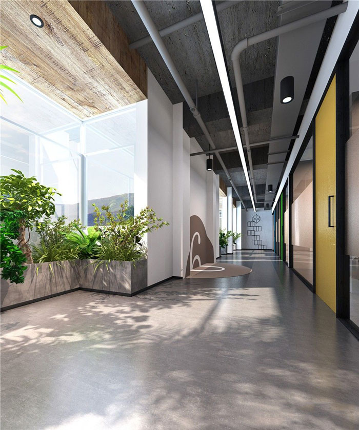 ? 過道區(qū)域的設計:設計師在設計的時候,以點綴為主要設計目的,硬裝之余以綠植做為主要的點綴飾物,將自然很好的引入室內。