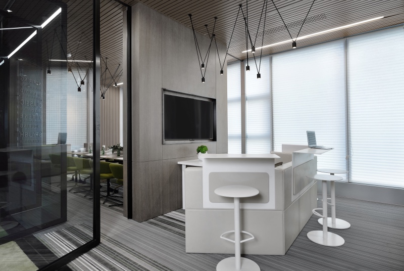 門(mén)廳區(qū)域摒棄傳統(tǒng)冷冰冰的接待形式,由超級(jí)吧臺(tái)、茶歇區(qū)、健康辦公區(qū)、討論區(qū)等功能組合而成,把互聯(lián)網(wǎng)開(kāi)放性思維植入到日常辦公生活中。同時(shí)利用健康跑道地毯將整個(gè)空間串聯(lián)起來(lái),讓空間更加具有活力和生氣。