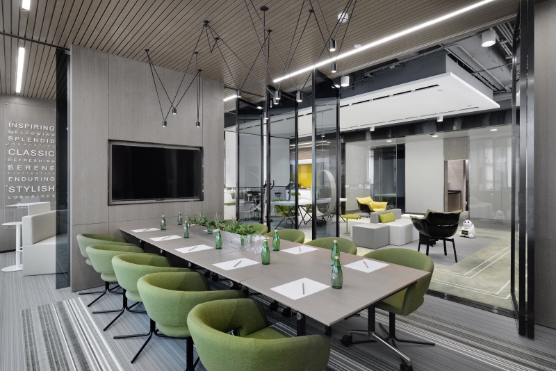 會(huì)議空間分為兩個(gè)空間,一個(gè)是集會(huì)議、培訓(xùn)、活動(dòng)于一體的多功能會(huì)議室,另一個(gè)集洽談、路演、討論于一體的創(chuàng)意互動(dòng)區(qū),僅需開(kāi)關(guān)移門(mén),即可讓空間改變不同的功能屬性,迅速與其他場(chǎng)所互動(dòng)。