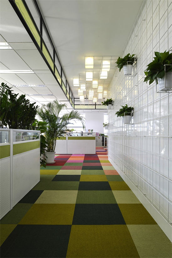 2000平方辦公室裝潢以彩色玻璃隔斷的顏色分出四個會議區(qū)域,紅黃藍(lán)綠。每個區(qū)域中的顏色又都有十幾種微妙的變化,共計54種彩色玻璃的顏色,在環(huán)形走廊上完成色彩的循環(huán)。在墻面上,設(shè)計師用白色瓷磚做辦公空間內(nèi)環(huán)形走道的墻面。利用材料的反射性能,彩色光暈在空間中能流動起來。像水彩在紙上洇開一樣,形成氤氳彌漫的效果。同時,考慮到辦公空間的進(jìn)深較大,白色瓷磚能夠反射外部光線,增加室內(nèi)空間的光亮度。