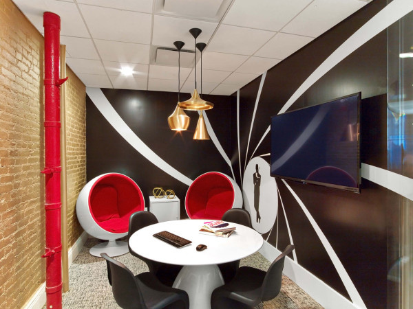 廣告公司辦公室會(huì)客區(qū)設(shè)計(jì):裸露管道被刷成紅色,同時(shí)還設(shè)計(jì)了窩型的坐椅,很有創(chuàng)意感,墻壁上手繪了黑白線條的裝飾畫,空間布置得很有藝術(shù)范兒氣息。公司的VIP會(huì)客室設(shè)計(jì)了玻璃門可以保持大空間的通透感,室內(nèi)的墻壁和天花板都設(shè)計(jì)成紫色調(diào)的,帶來奢華神秘的視覺感,墻壁上掛著裝飾畫,為空間營(yíng)造出藝術(shù)風(fēng)氣息。