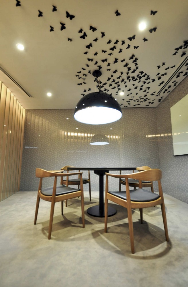 令人驚艷的會議室,那滿目鮮艷欲滴的紅色花卉彌漫了大半的會議室空間;小型會議室則以美麗的蝴蝶為設(shè)計主題,疏密的布局令空間充滿動感;
