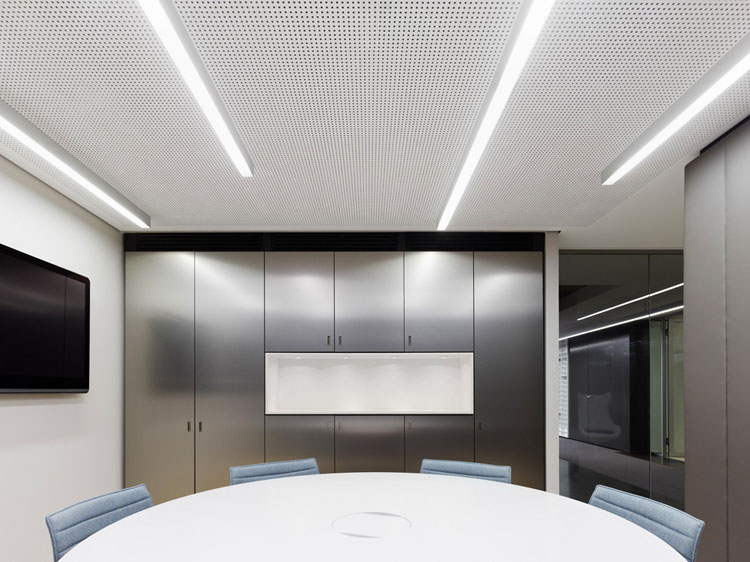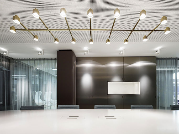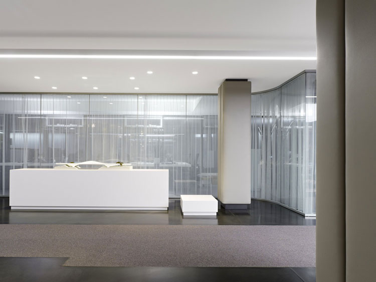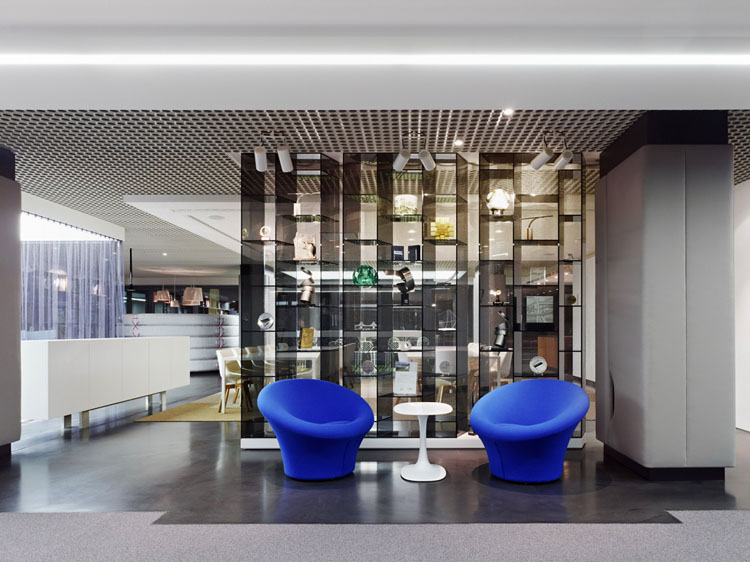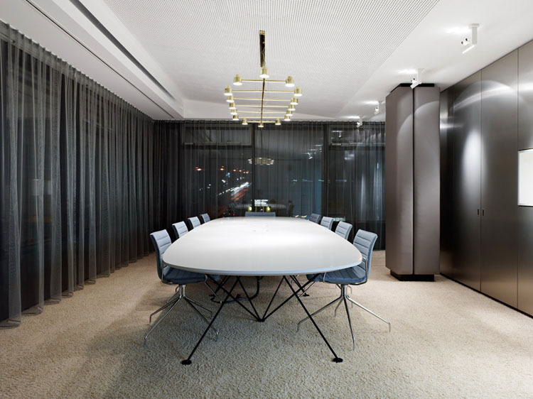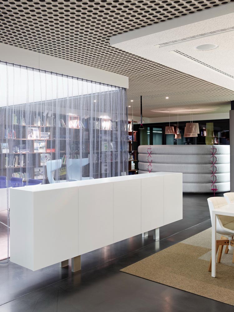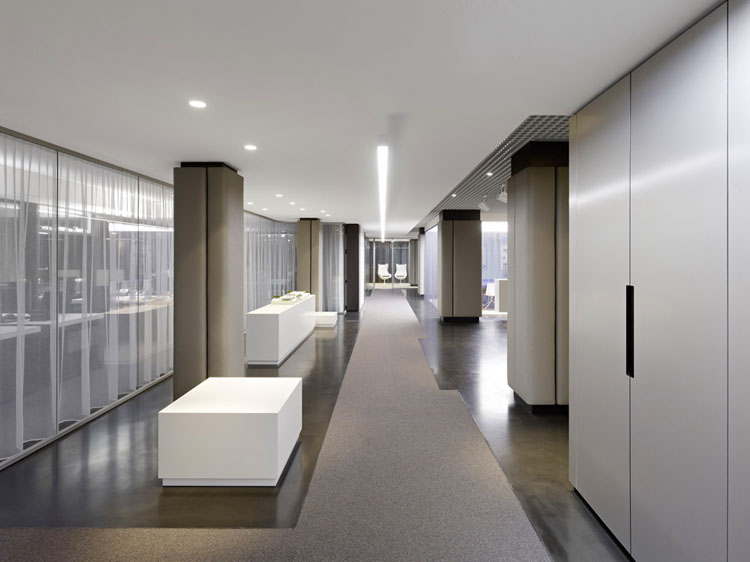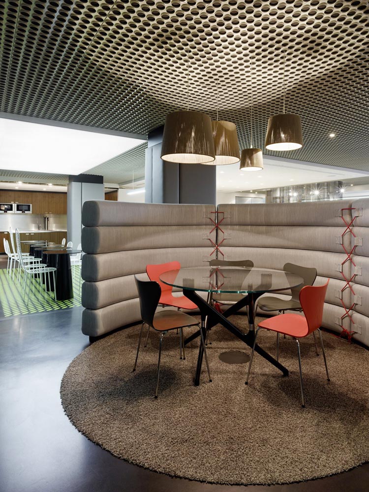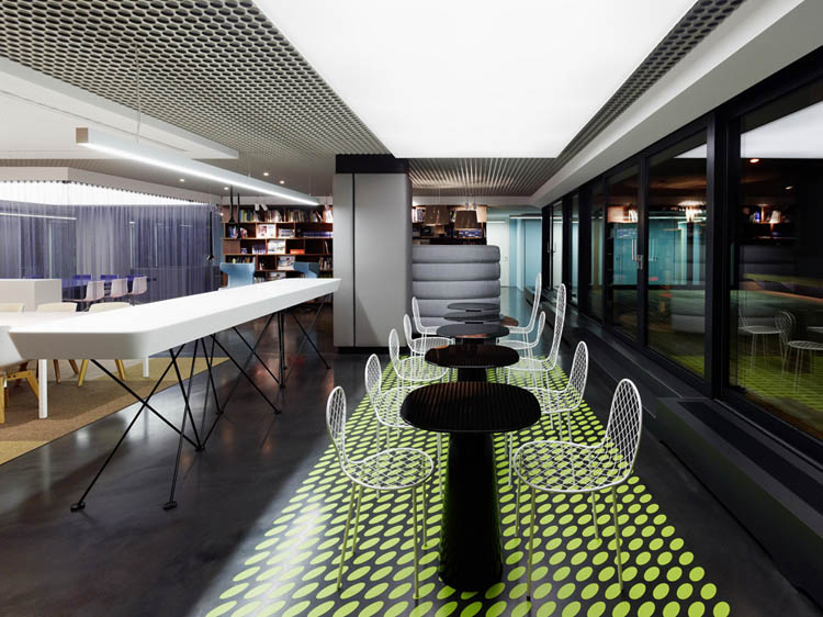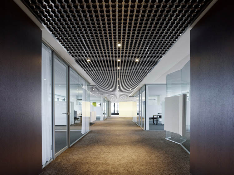 其概念是設(shè)置一個(gè)為所有部門共用的交流空間,以及滿足不同協(xié)作需要的不同分區(qū)。原先單獨(dú)、分散化的辦公室變成大型開放式的辦公空間,鼓勵(lì)同事之間的交流。每一個(gè)樓層都有單獨(dú)的辦公室和單獨(dú)的工作組空間,以及大型開放式工作間。各個(gè)工作站的工作人員能夠相互交流。玻璃立面的辦公室中,十字形的結(jié)構(gòu)將開放式的空間分隔為各個(gè)單元,但又是集中的工作環(huán)境。一系列暖色調(diào)的材料營造出不同的氣氛,有時(shí)候讓員工感覺到像在家里一樣。辦公樓中的地毯有著清晰的路徑指示和功能分區(qū)。就餐區(qū)地板上的綠點(diǎn)如同變魔術(shù)一樣變出草地的效果,構(gòu)筑起通向露臺(tái)的一道概念式的橋梁。向露臺(tái)打開的半圓形裝飾空間與其他部分區(qū)分開來,透明的蕾絲幕布構(gòu)成了半私密的空間,而清新的色彩、深藍(lán)色的桌子和粉色的地毯,無不為員工帶來激發(fā)工作情緒的氛圍。